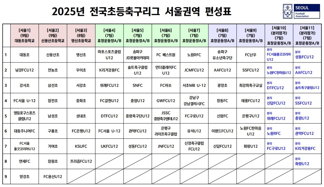 2025년도 전국 초등 축구리그 권역편성표 - [서울]